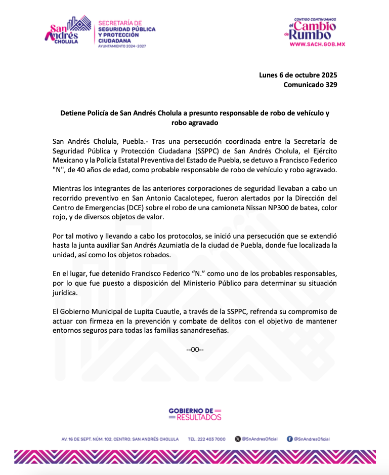 San Andrés Cholula, Puebla.- Tras una persecución coordinada entre la Secretaría de Seguridad Pública y Protección Ciudadana (SSPPC) de San Andrés Cholula, el Ejército Mexicano y la Policía Estatal Preventiva del Estado de Puebla, se detuvo a Francisco Federico “N”, de 40 años de edad, como probable responsable de robo de vehículo y robo agravado.