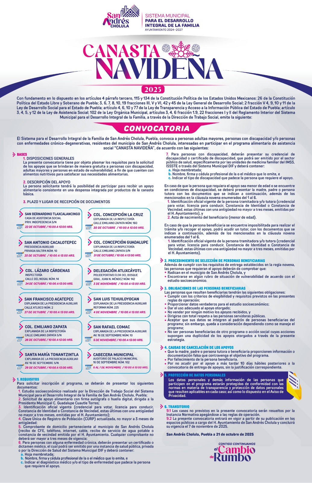 Por su parte, la directora general del Sistema Municipal DIF (SMDIF) informó que el registro para ser persona beneficiaria es del 22 de octubre al 07 de noviembre, mientras que la entrega de despensas se realizará del 02 al 17 de diciembre de 2025, en los lugares indicados en la convocatoria, la cual puede consultarse en las plataformas digitales del Ayuntamiento de San Andrés Cholula.