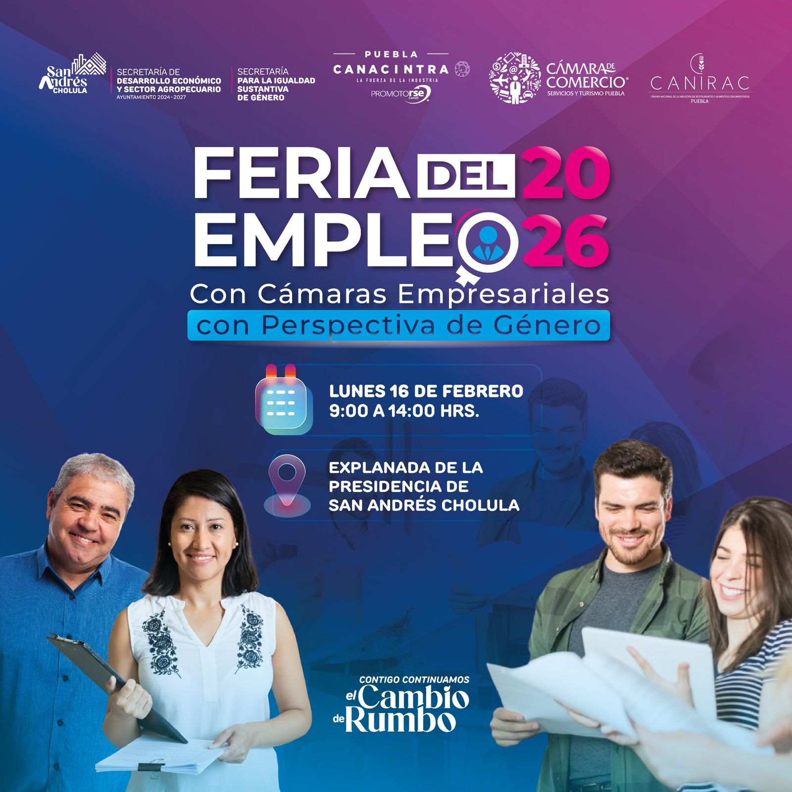 San Andrés Cholula, Puebla. – La presidenta municipal Lupita Cuautle, en conjunto con los presidentes de la Cámara de Comercio, Servicios y Turismo de Puebla (CANACO), Manuel Flores Fernández y de la Cámara Nacional de la Industria de Transformación Puebla (CANACINTRA), Carlos Julián Sosa Spínola, presentó la “Feria del Empleo 2026 con Perspectiva de Género”.